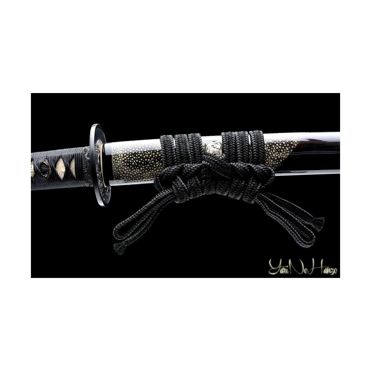 - Black lacquered high quality wooden saya decorated with real ray skin, strengthen with real buffalo horn