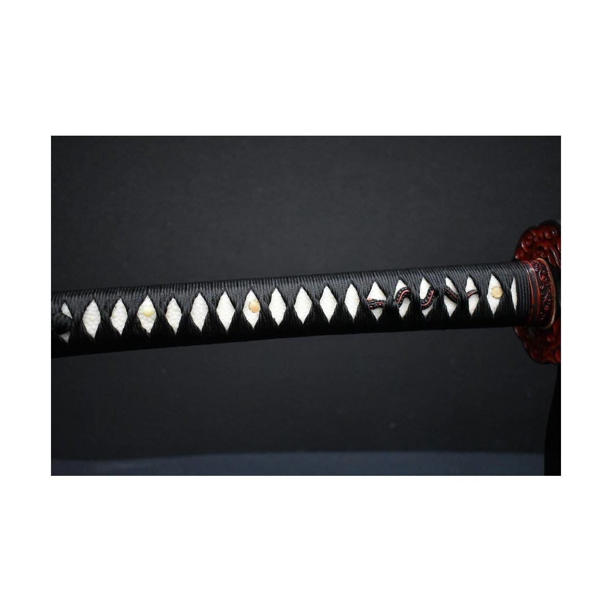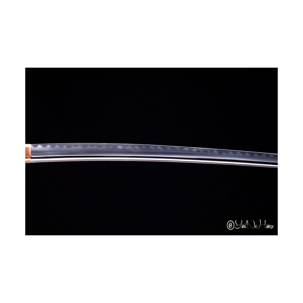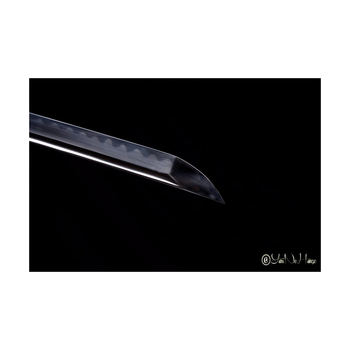 - Differentially hardened and clay tempered blade, authentic hamon Gunome Choji style.
