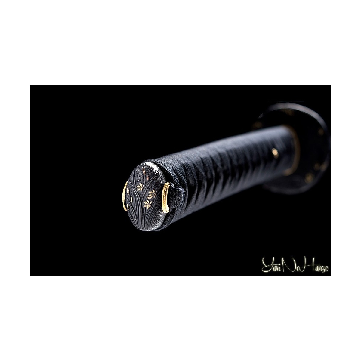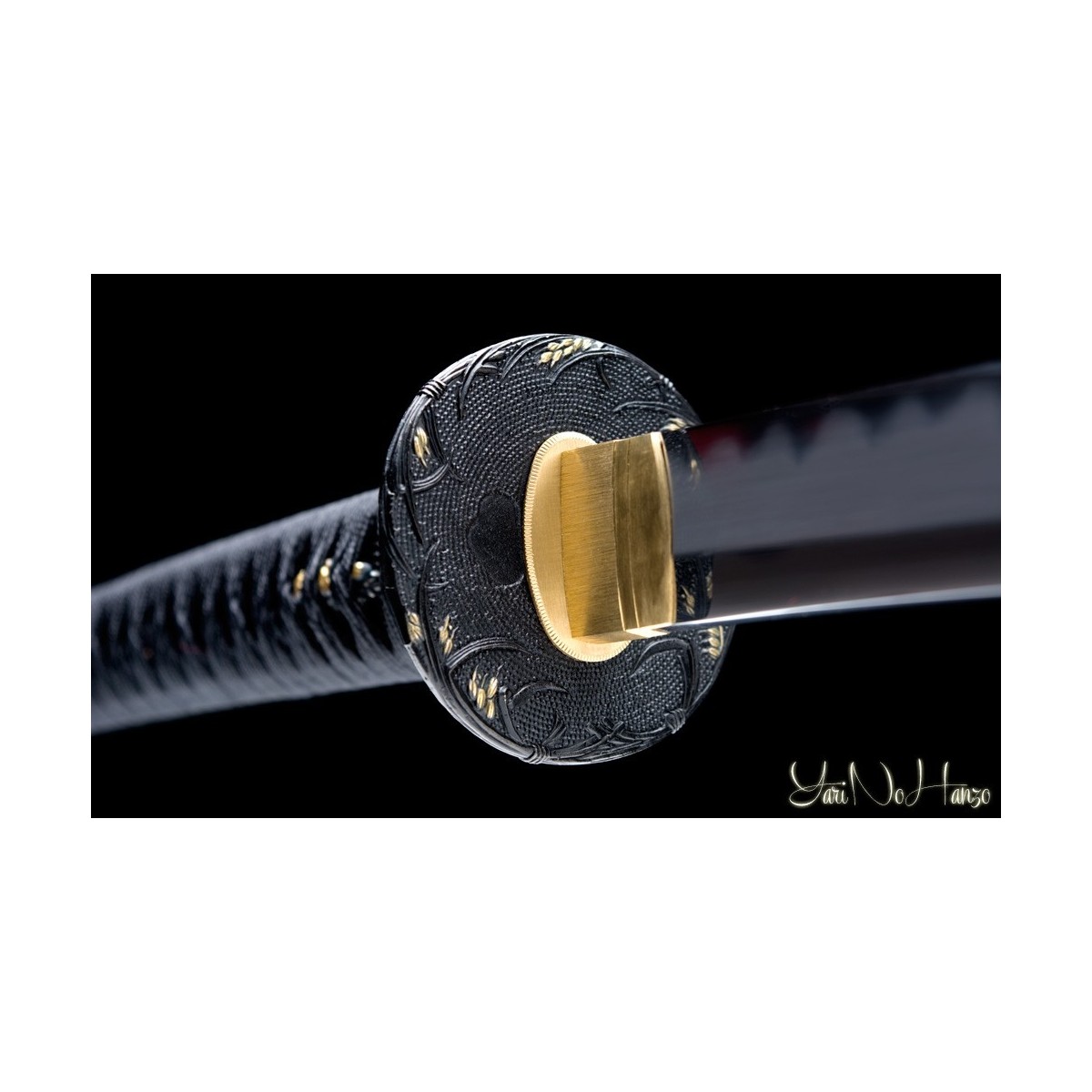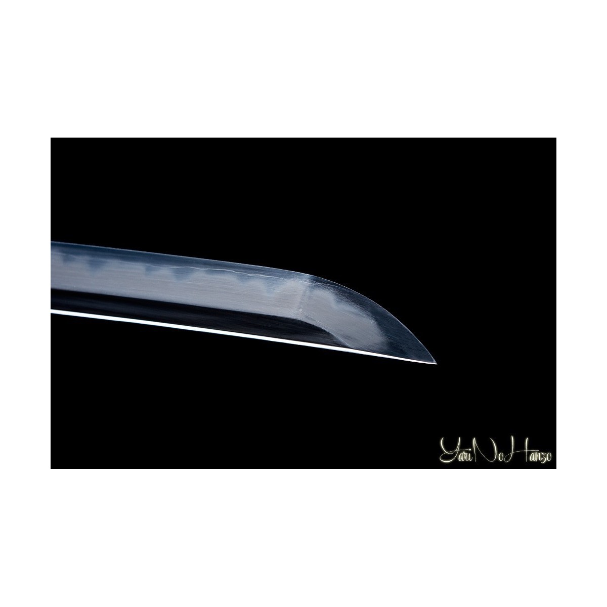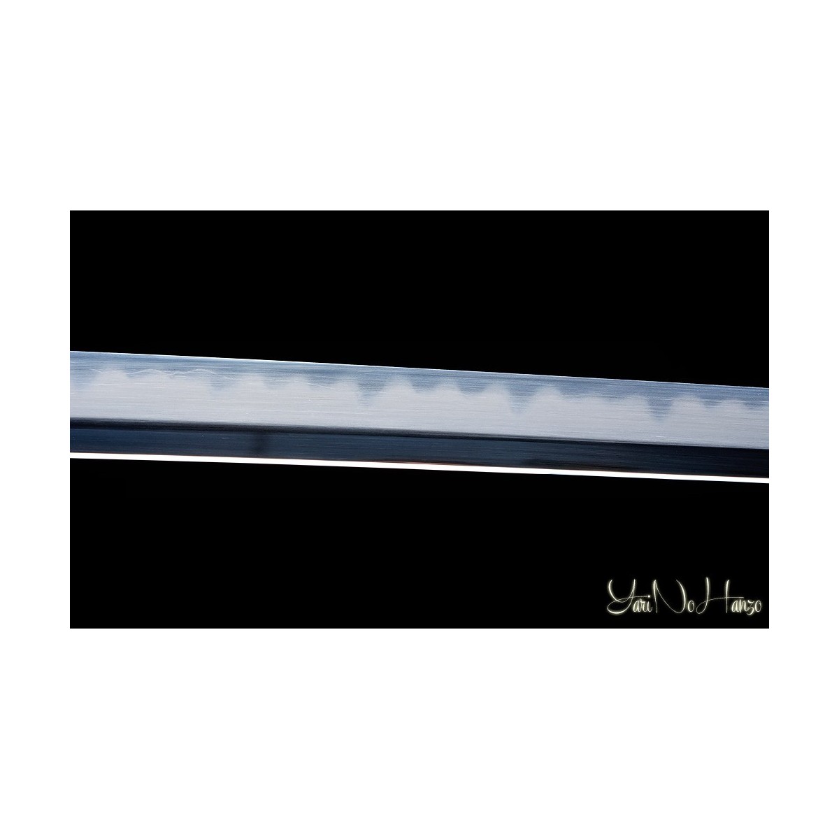 - Differentially hardened and clay tempered blade, authentic hamon gunome choji style. Deep Koshi type Sori typical of Bizen blades