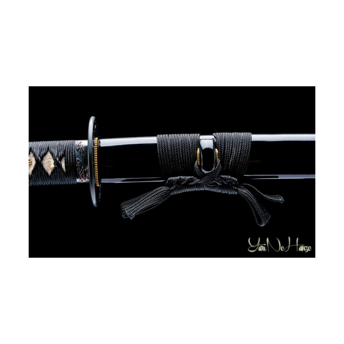 - Black lacquered wooden saya, black tsukaito, iron tsuba