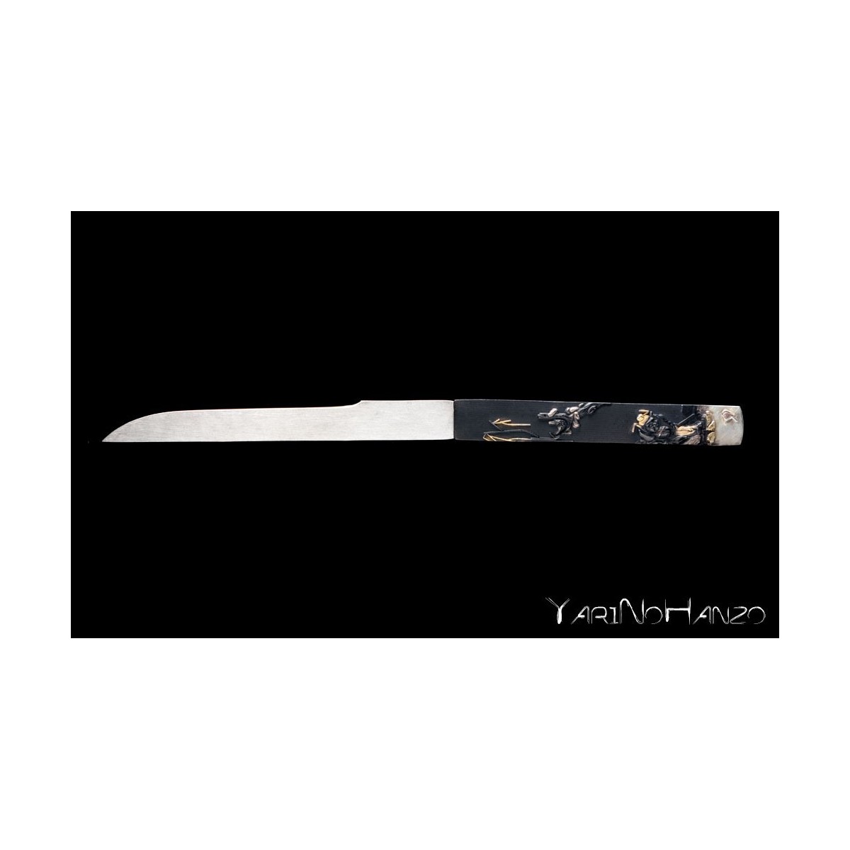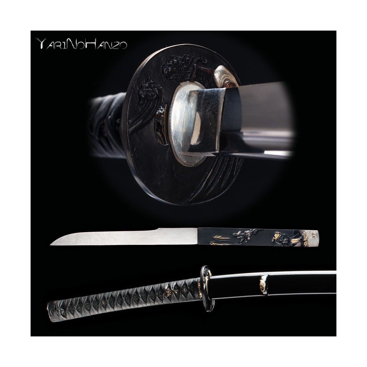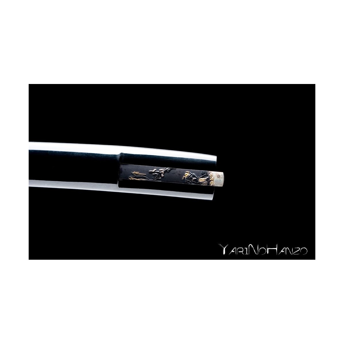- Black lacquered high quality wooden saya strengthen with real buffalo horn. Kogatana with Kozuka of the same subject as the Koshirae one and metal Kurikata