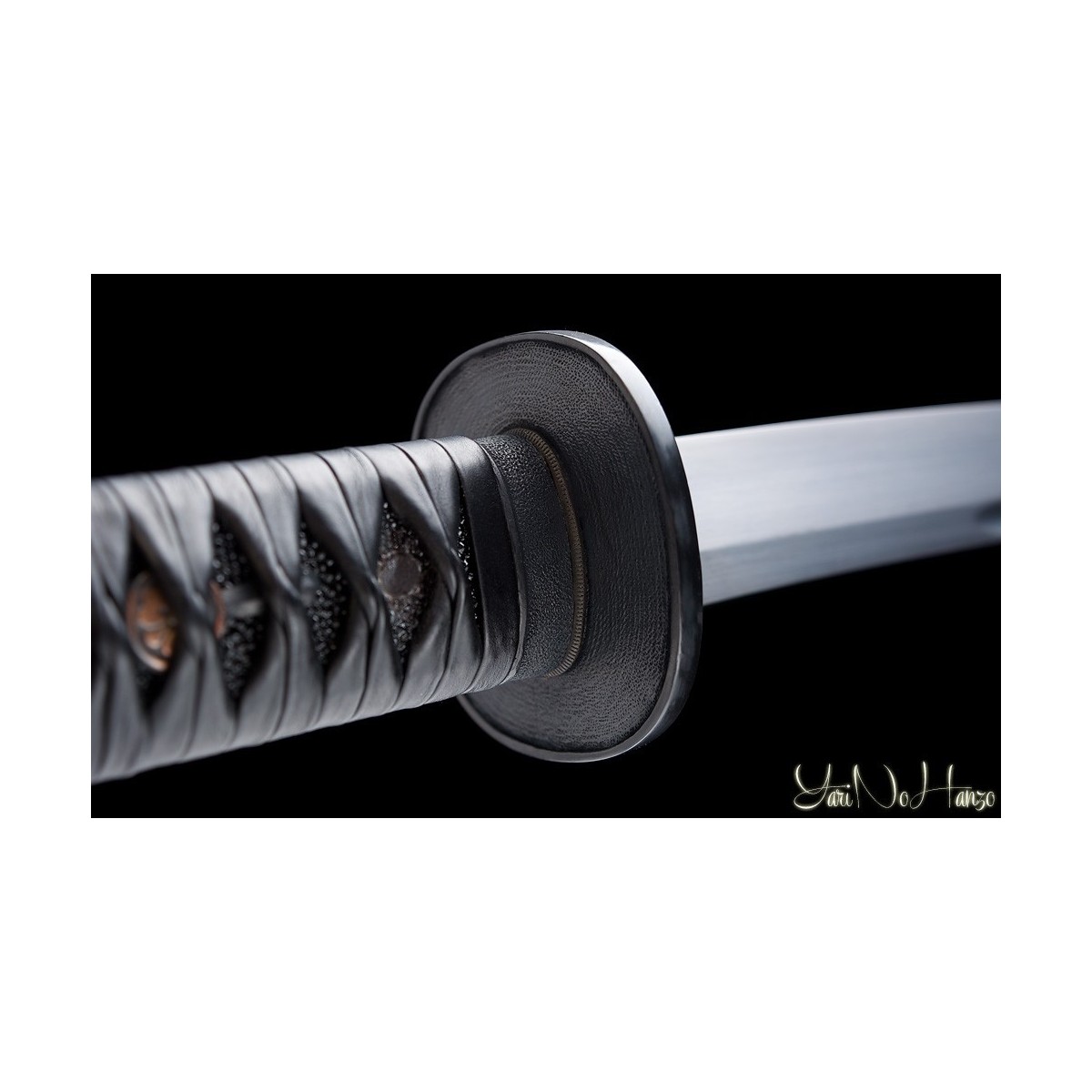 - Black leather tsukaito, samegawa in real black ray leather, traditional tsuba and old-looking copper finishes