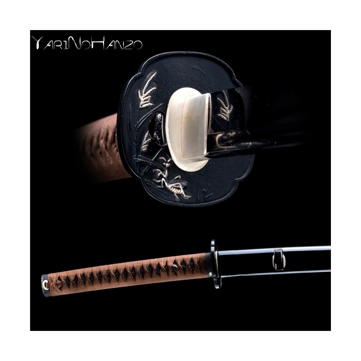 - Brown silk tsukaito, traditional Mokko style Tsuba and Koshirae with Kamakiri subject (praying mantis) reproduced on a piece of the Edo period