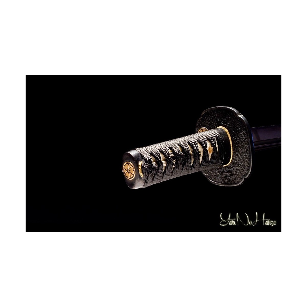 - Differentially hardened and clay tempered blade, authentic hamon Gunome Choji style