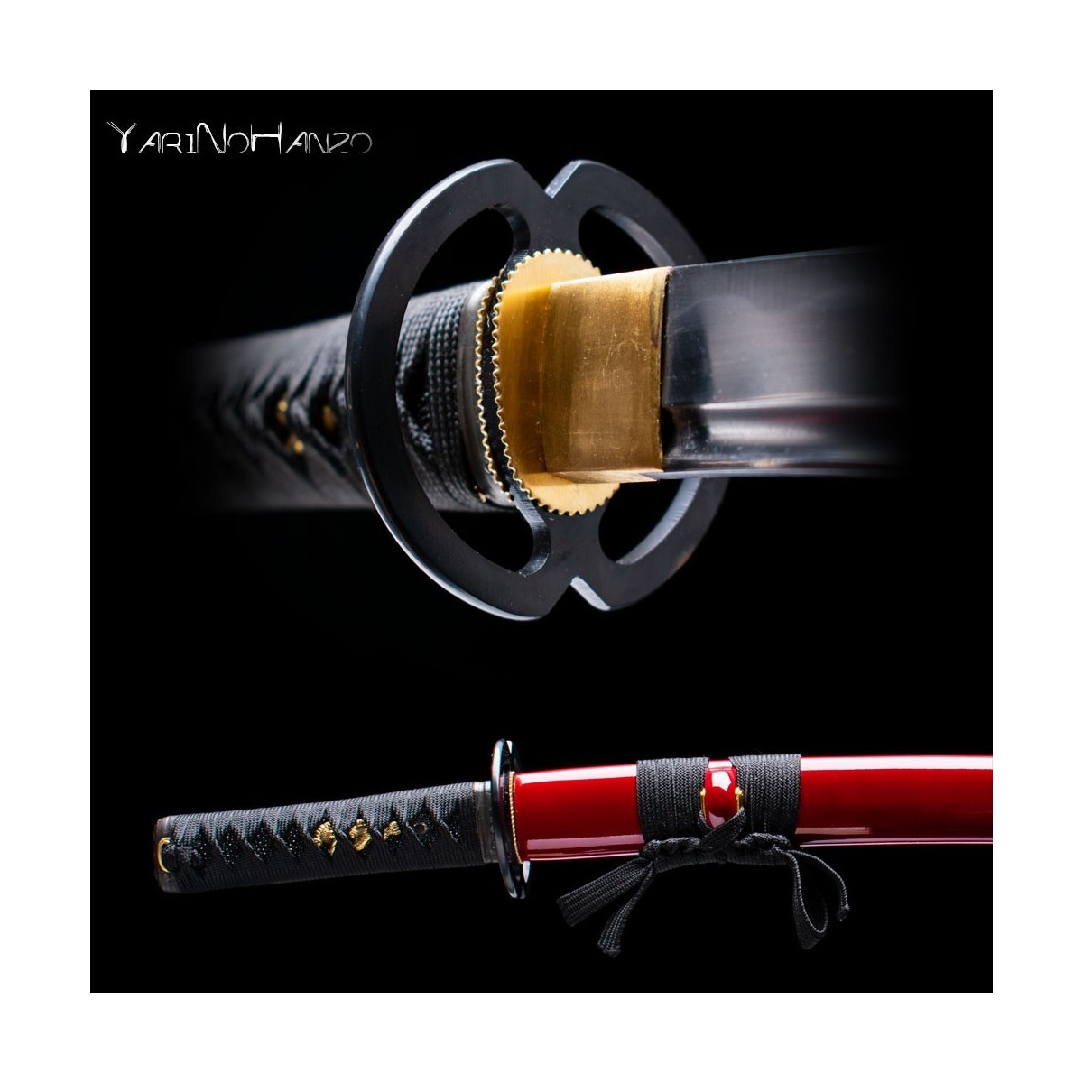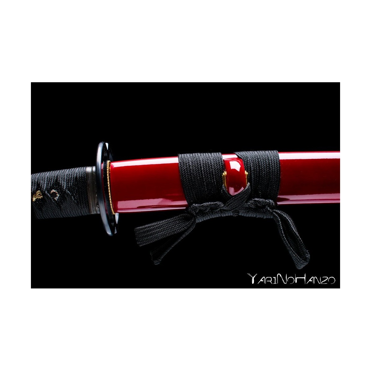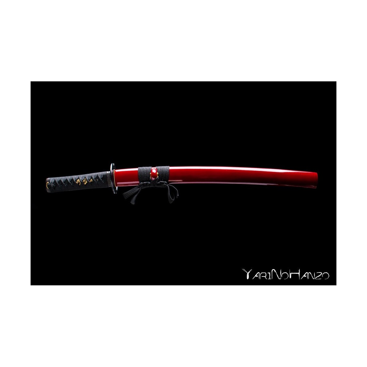 - Deep red lacquered wooden saya, black tsukaito, iron tsuba