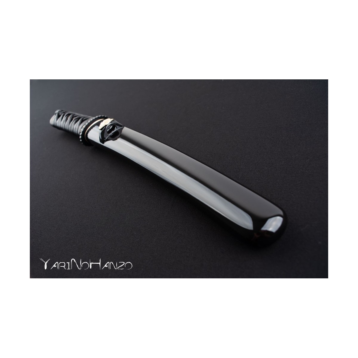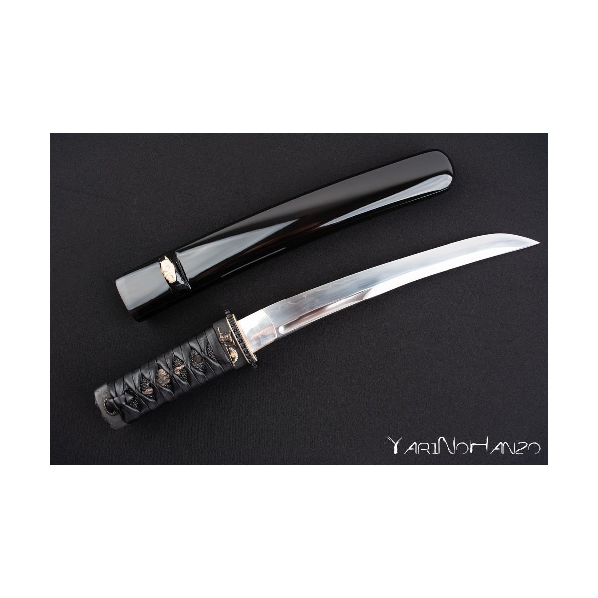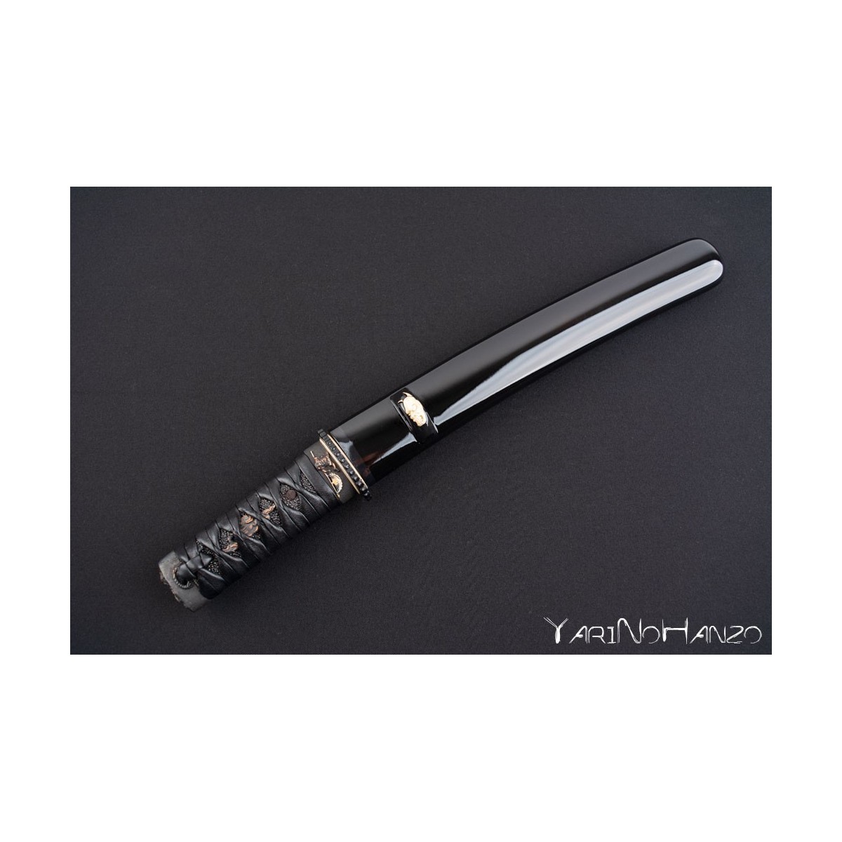 - Black lacquered high quality wooden saya strengthen with real buffalo horn. Kogatana with Kozuka of the same subject as the Koshirae one and metal Kurikata