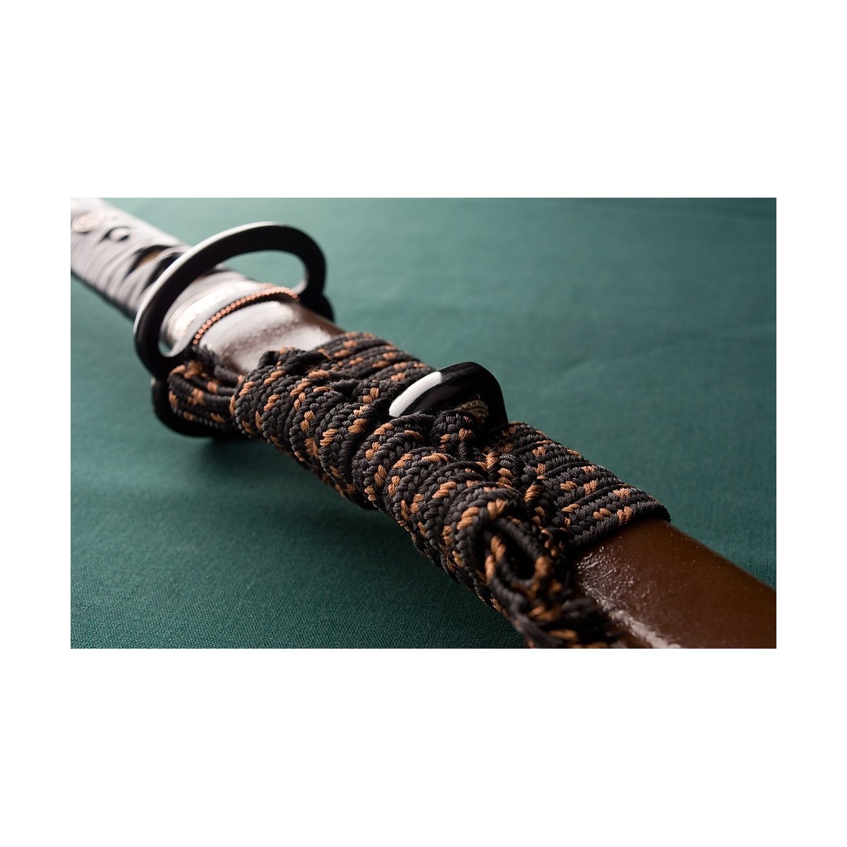 Higo style Fuchikashira (metal fittings), katatemaki (wrapping) made of top quality leather. Tsuba Musashi, saya in brown ishime.