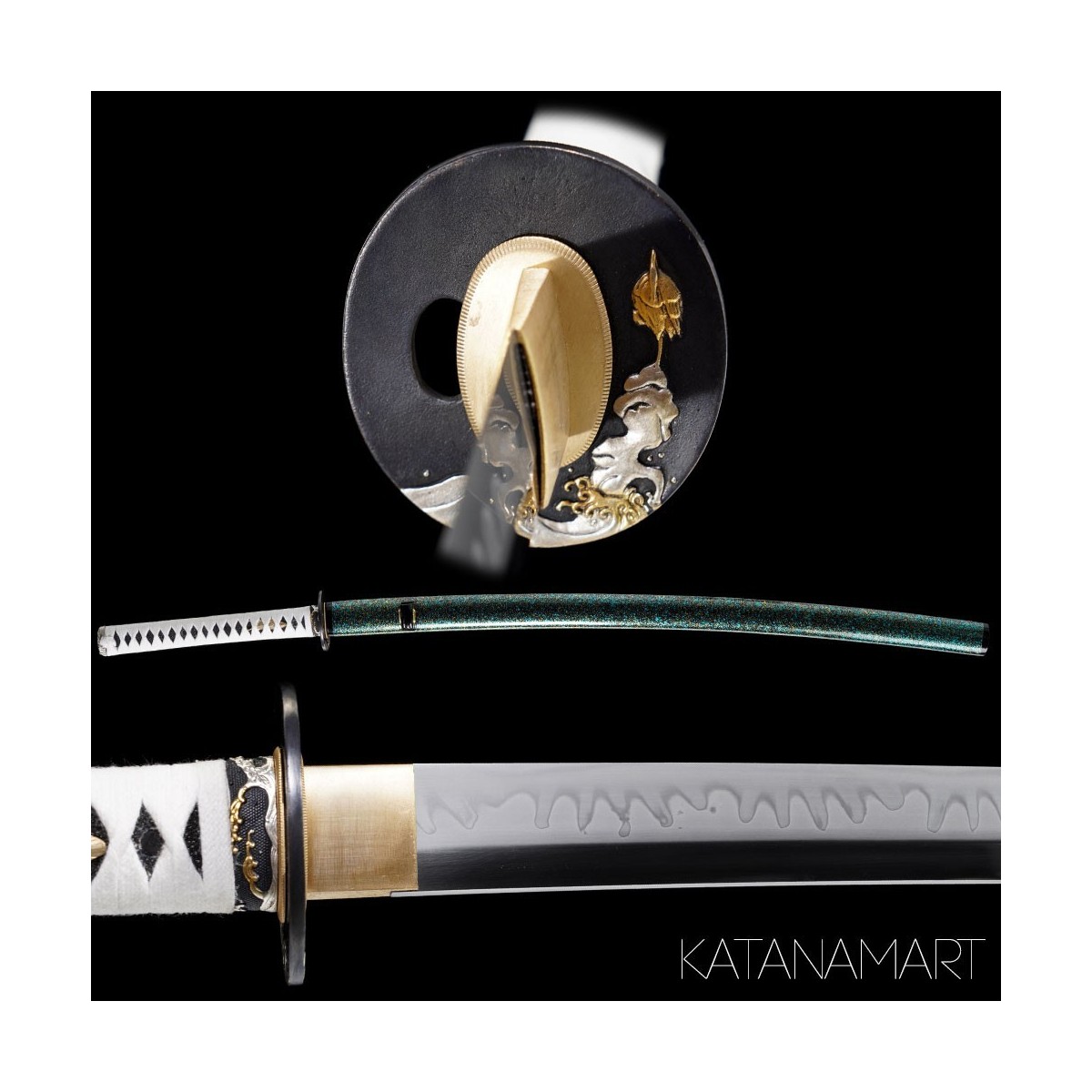 - Naga marugata tsuba with elegant Nami (wave) themed koshirae.