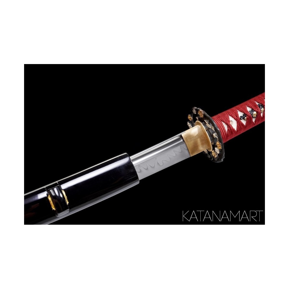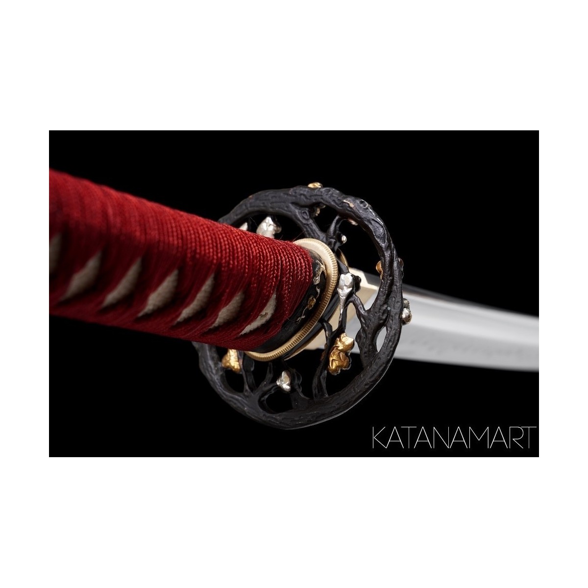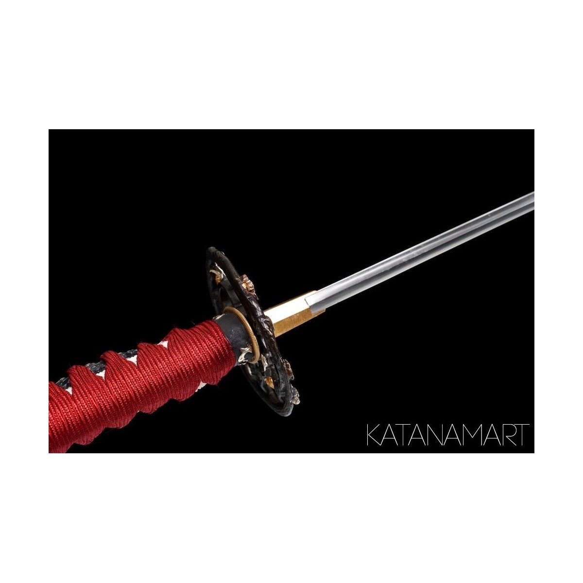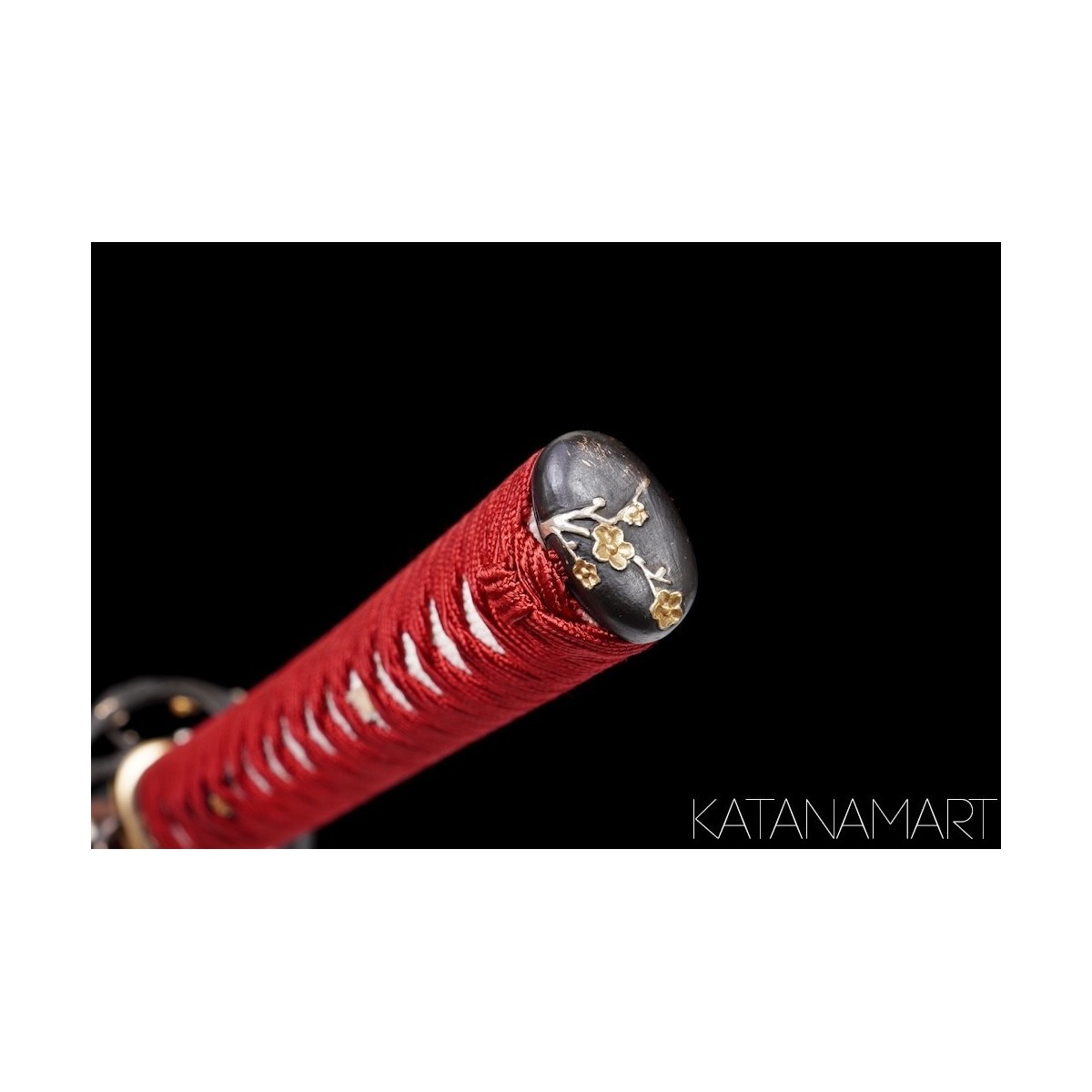 - Red Japanese silk tsukaito, hinerimaki wrap for durability and grip.