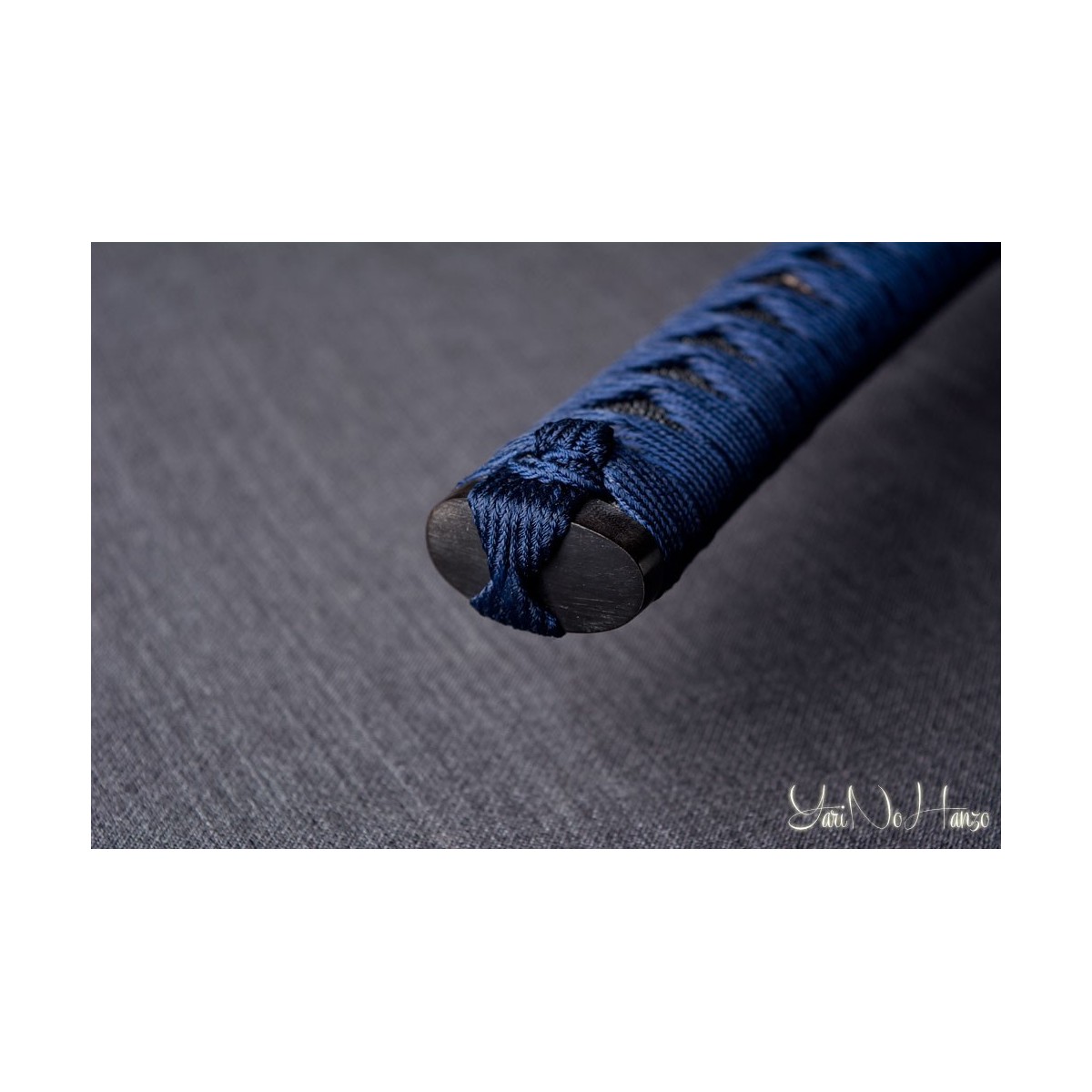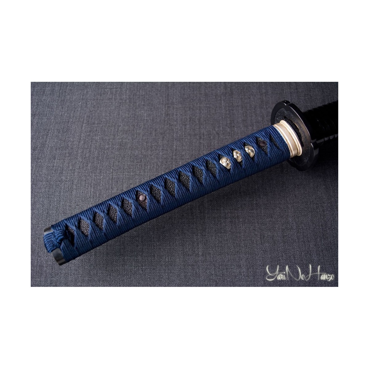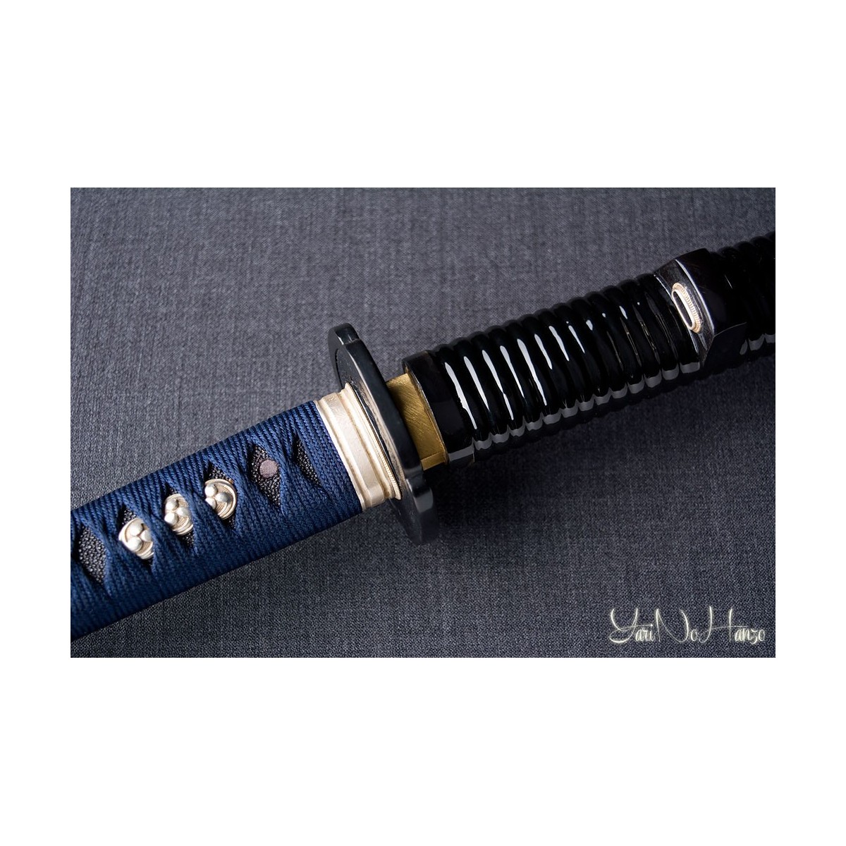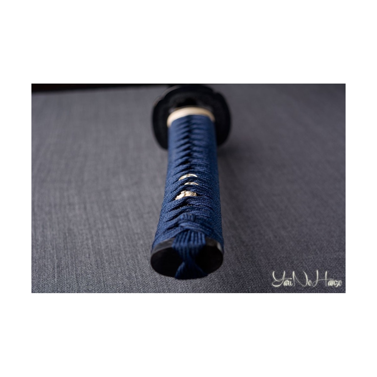 - Blue silk tsuka maki and real ray skin samegawa. Traditional mokko tsuba and Kashira made of real buffalo horn