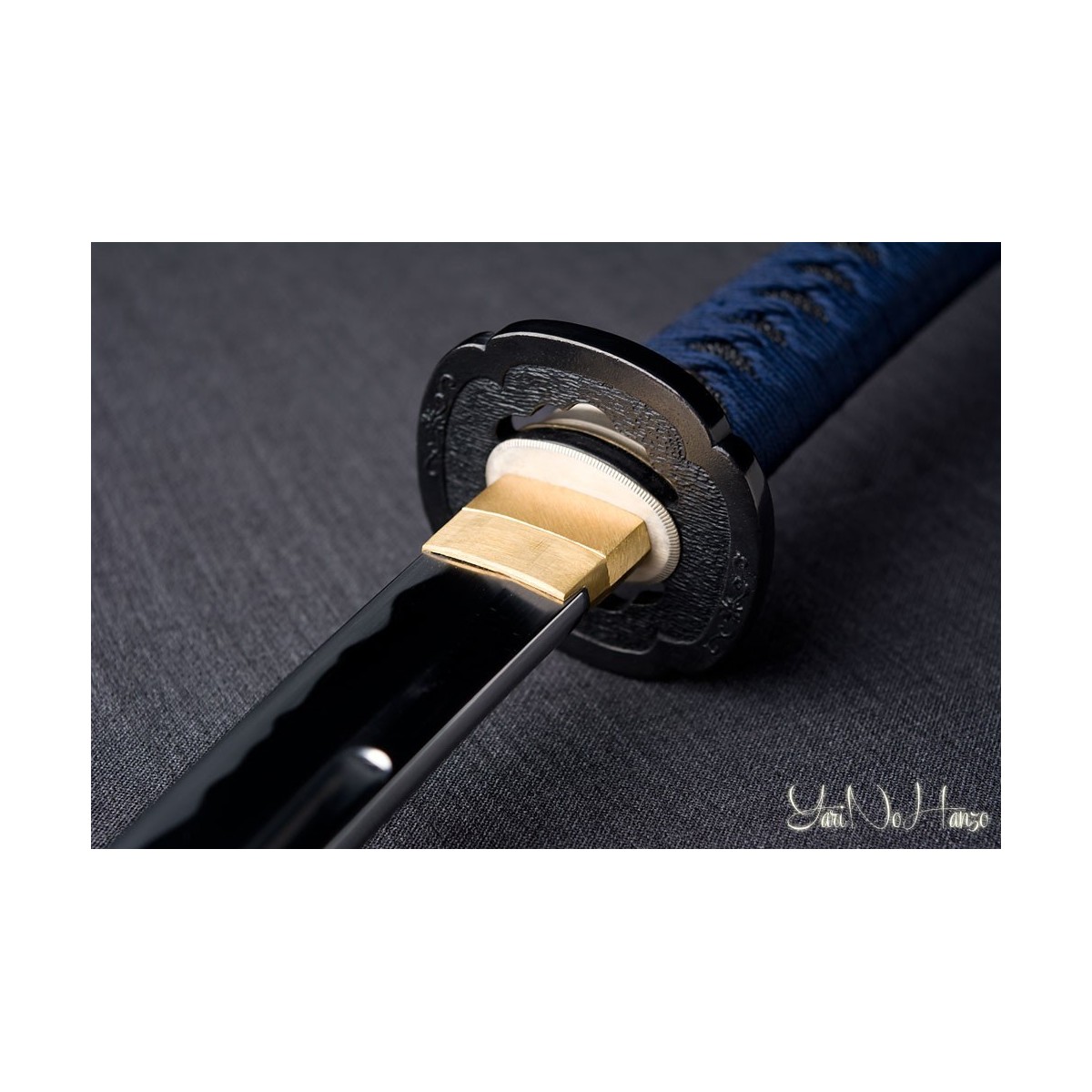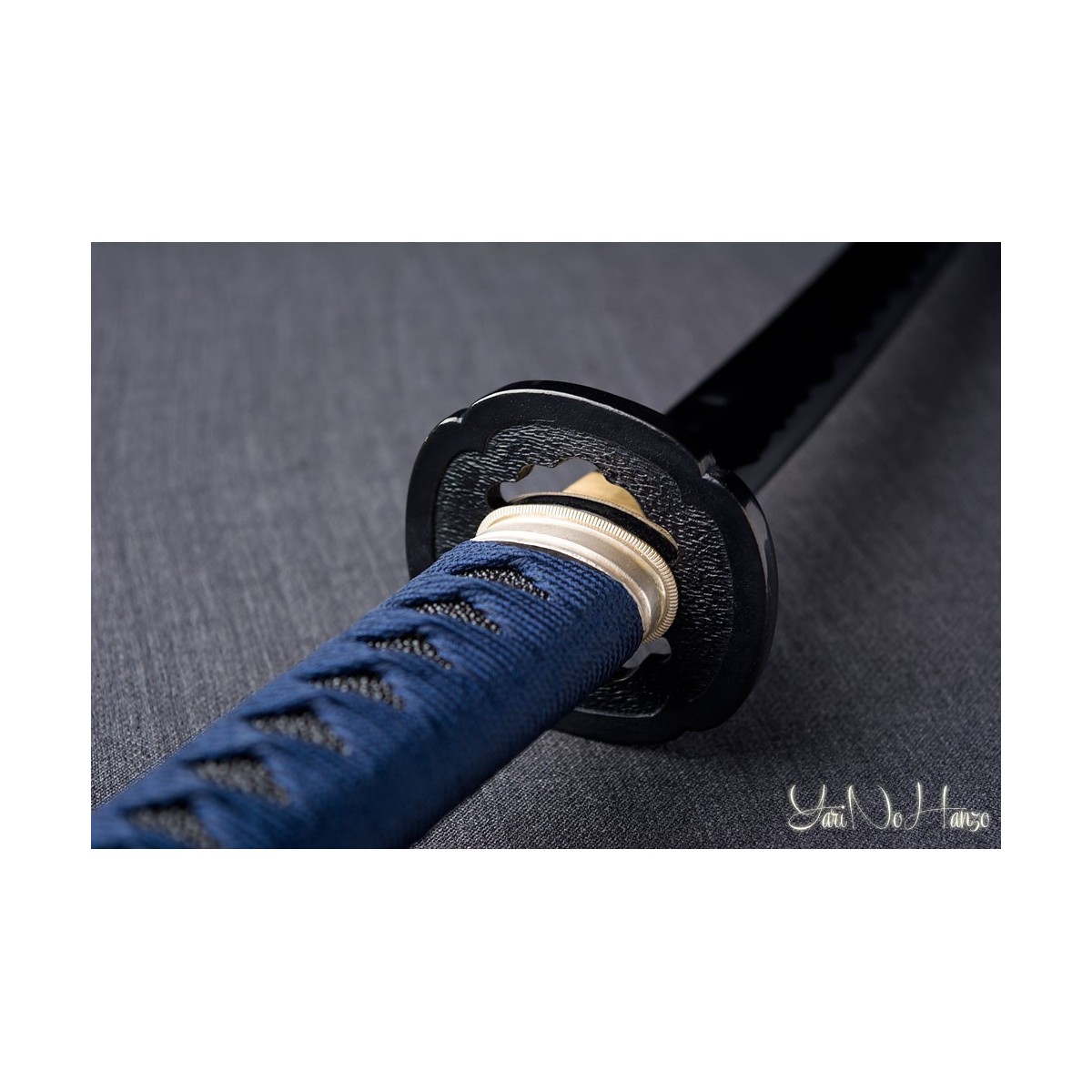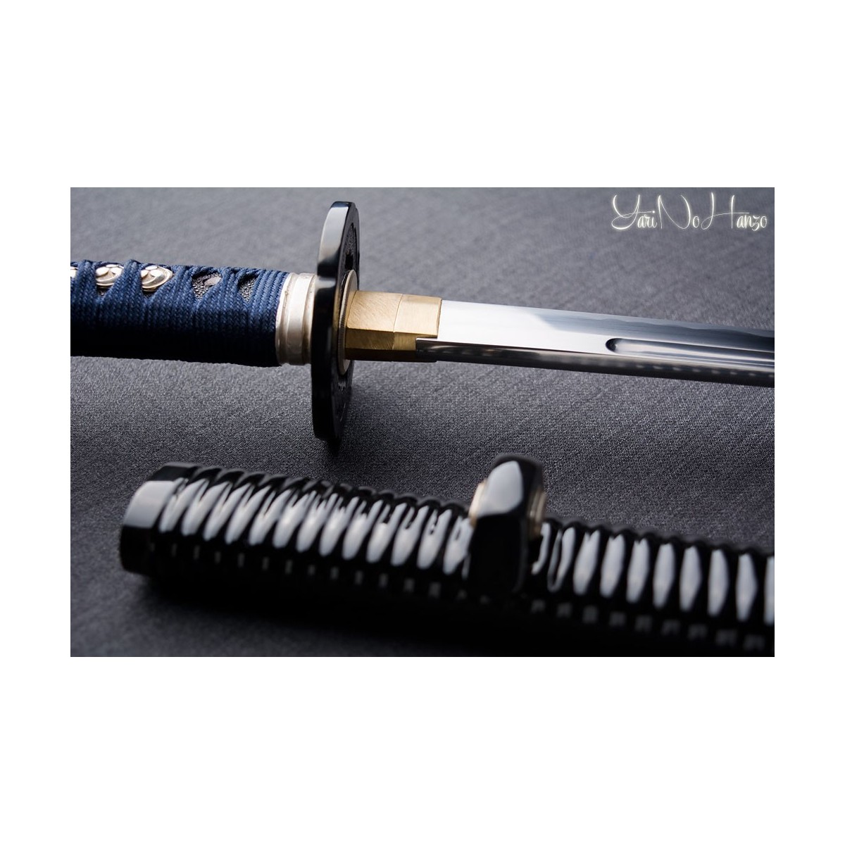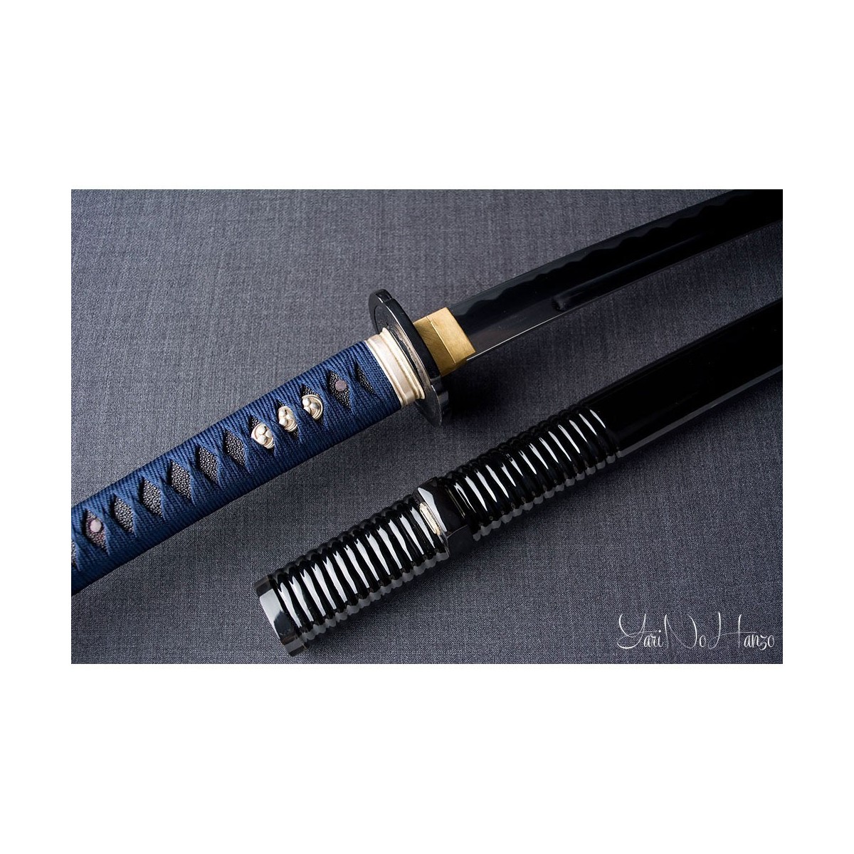 - Blue silk tsuka maki and real ray skin samegawa. Traditional mokko tsuba and Kashira made of real buffalo horn