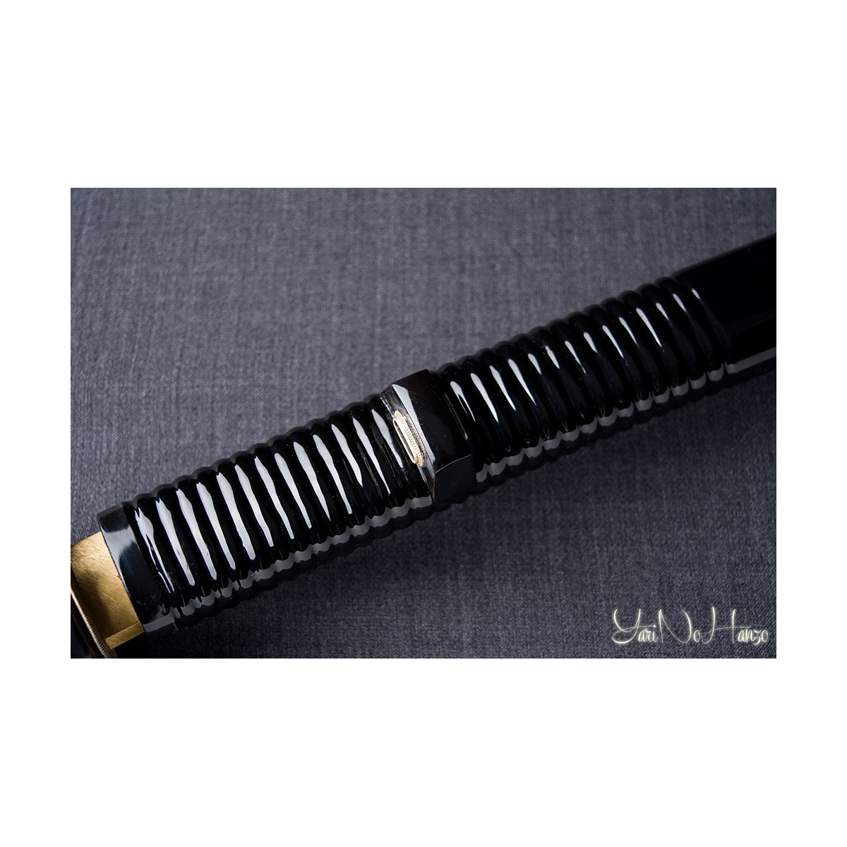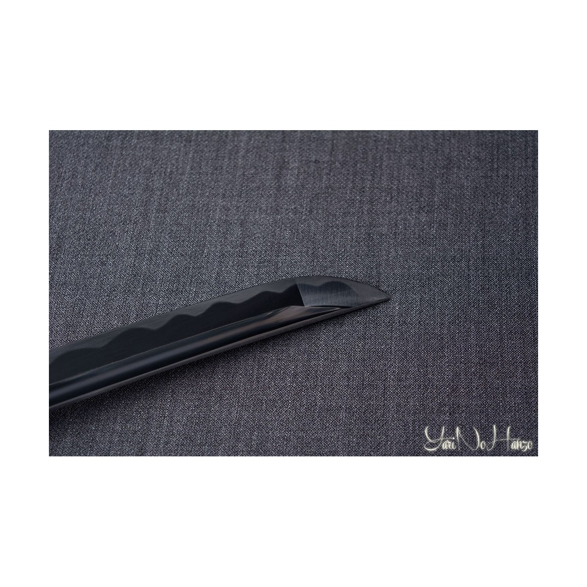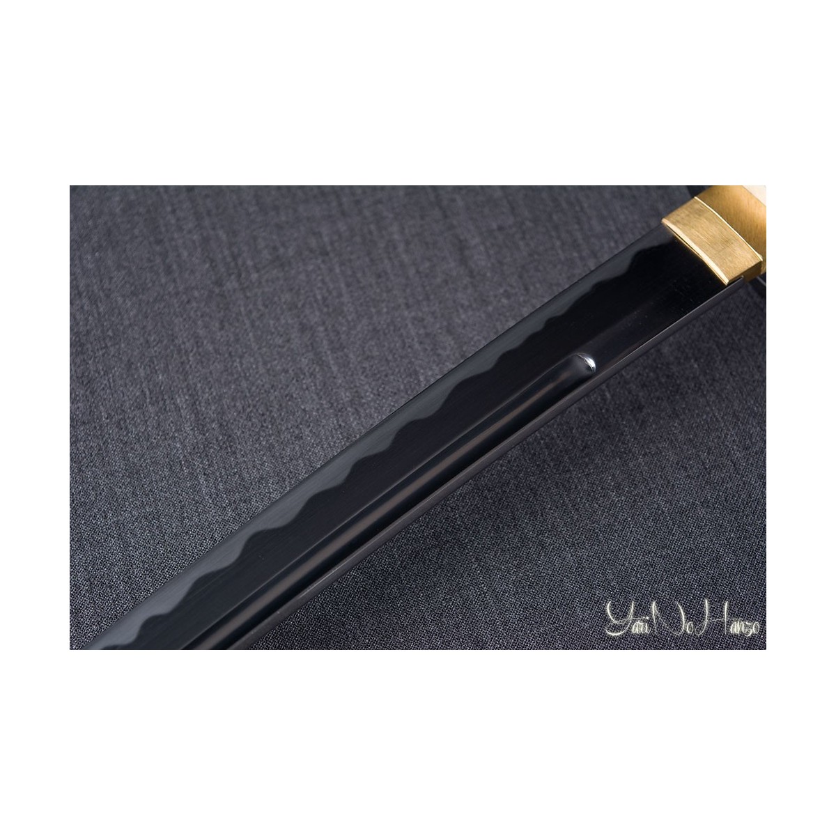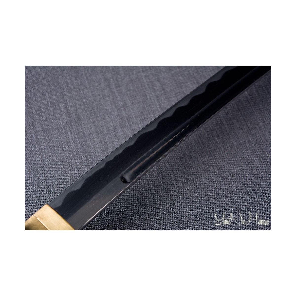 - 1060 high carbon steel balde, maru kitae with bohi, Hamon “Gunome Choji” Style. Full tang and fully functional